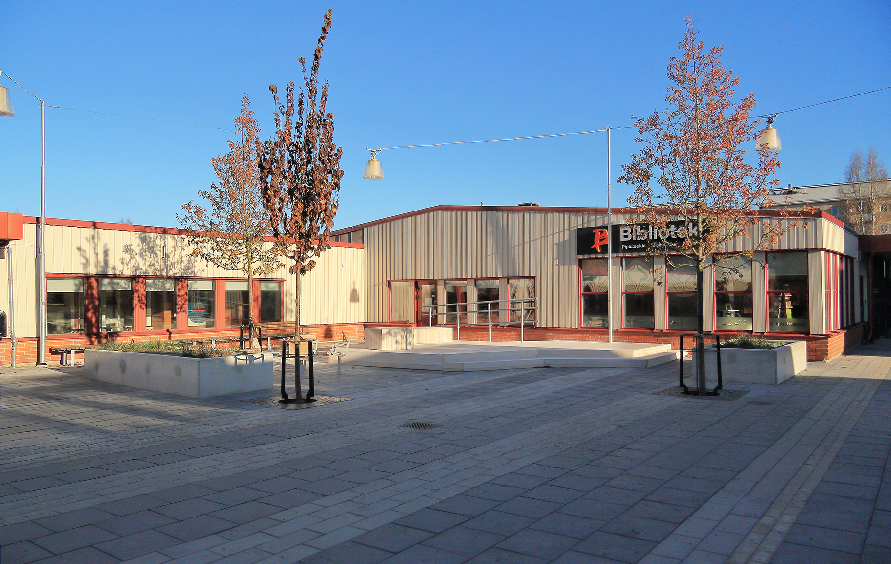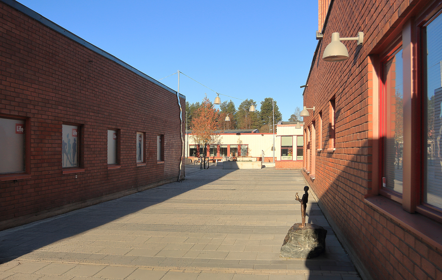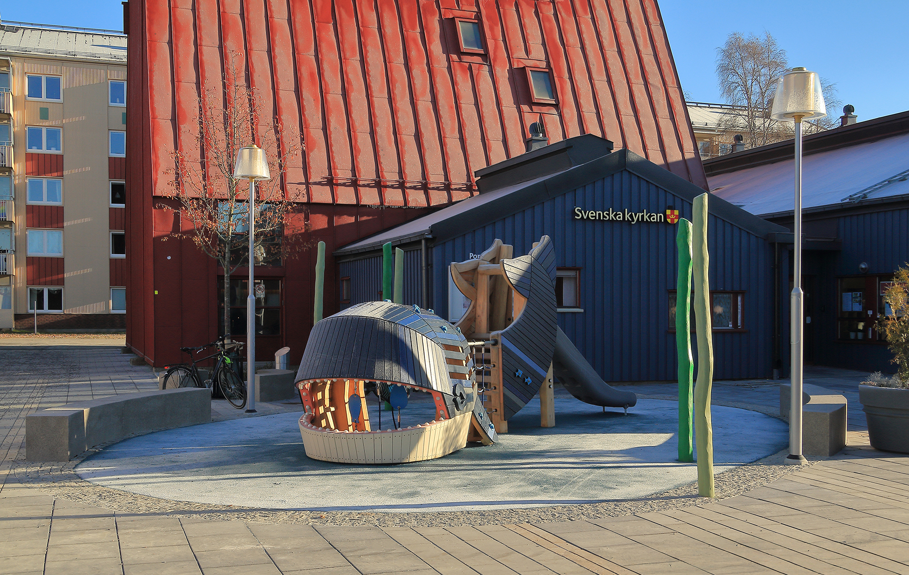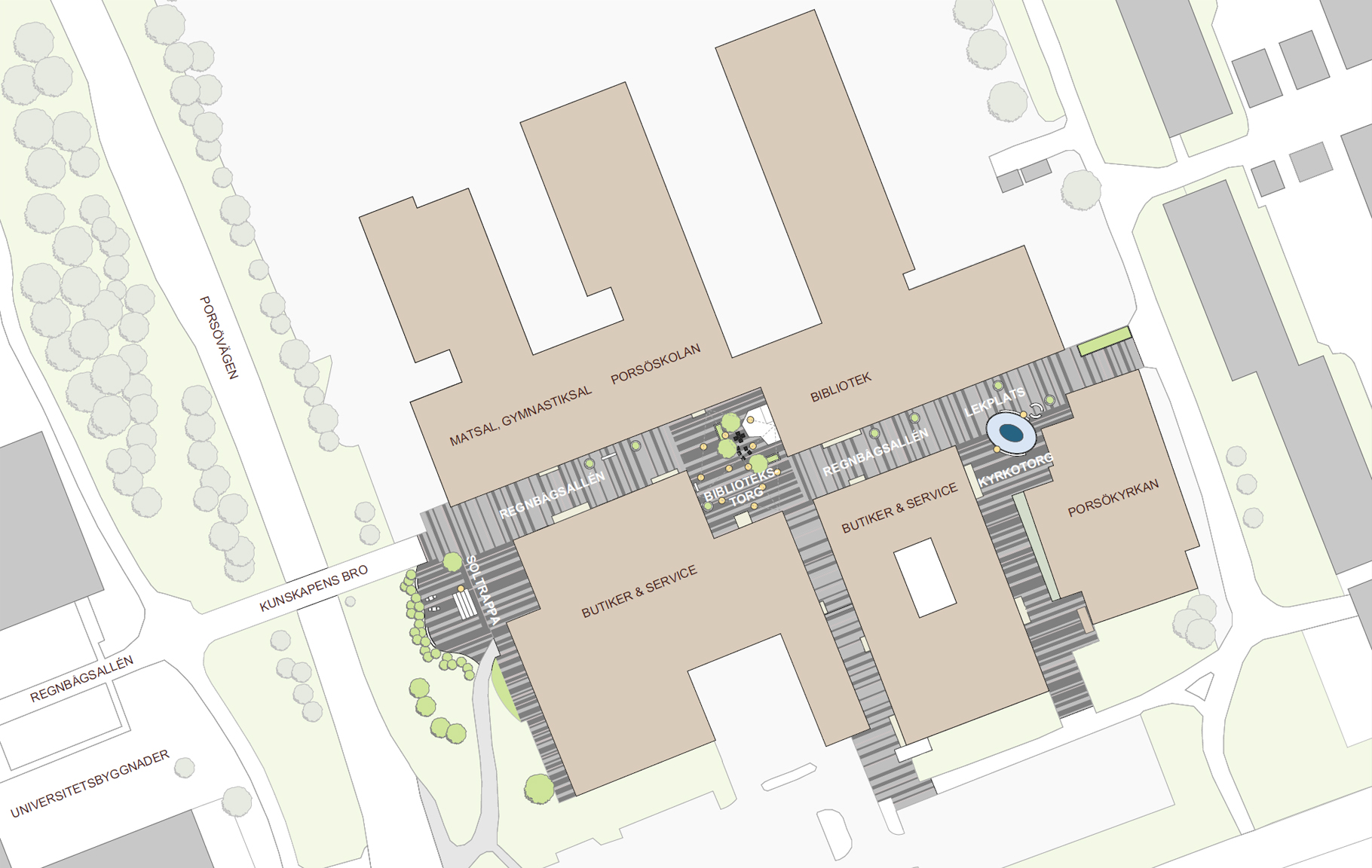 Utformningen av centrumet som porsöbornas vardagsrum har tolkats genom att göra en markbeläggning i betongsten inspirerad av trasmattor som ligger omlott, miljöbelysning med ett hemlikt uttryck, samt genom att möblera rumsbildningarna i centrumet för olika funktioner. Det finns tre utmärkande rumsbildningar som utmärker sig lite extra. Närmast kunskapens bro och universitetet ligger soltrappan som är en solig hängyta lämplig för en lunchpaus. I mitten av centrumet i anslutning till biblioteket finns en yta med scen och sittmöjligheter för mindre event som exempelvis lässtunder eller spelningar. Utanför kyrkans entré finns både sittplatser för spontana samlingar i anslutning till kyrkans verksamhet, såväl som en yta för lek med lekutrustning i form av en val. Förhoppningsvis kan placeringen bidra till mötet mellan olika åldrar eller så bidrar det bara till att fler barn framöver leker Jona som slukas av valen.
