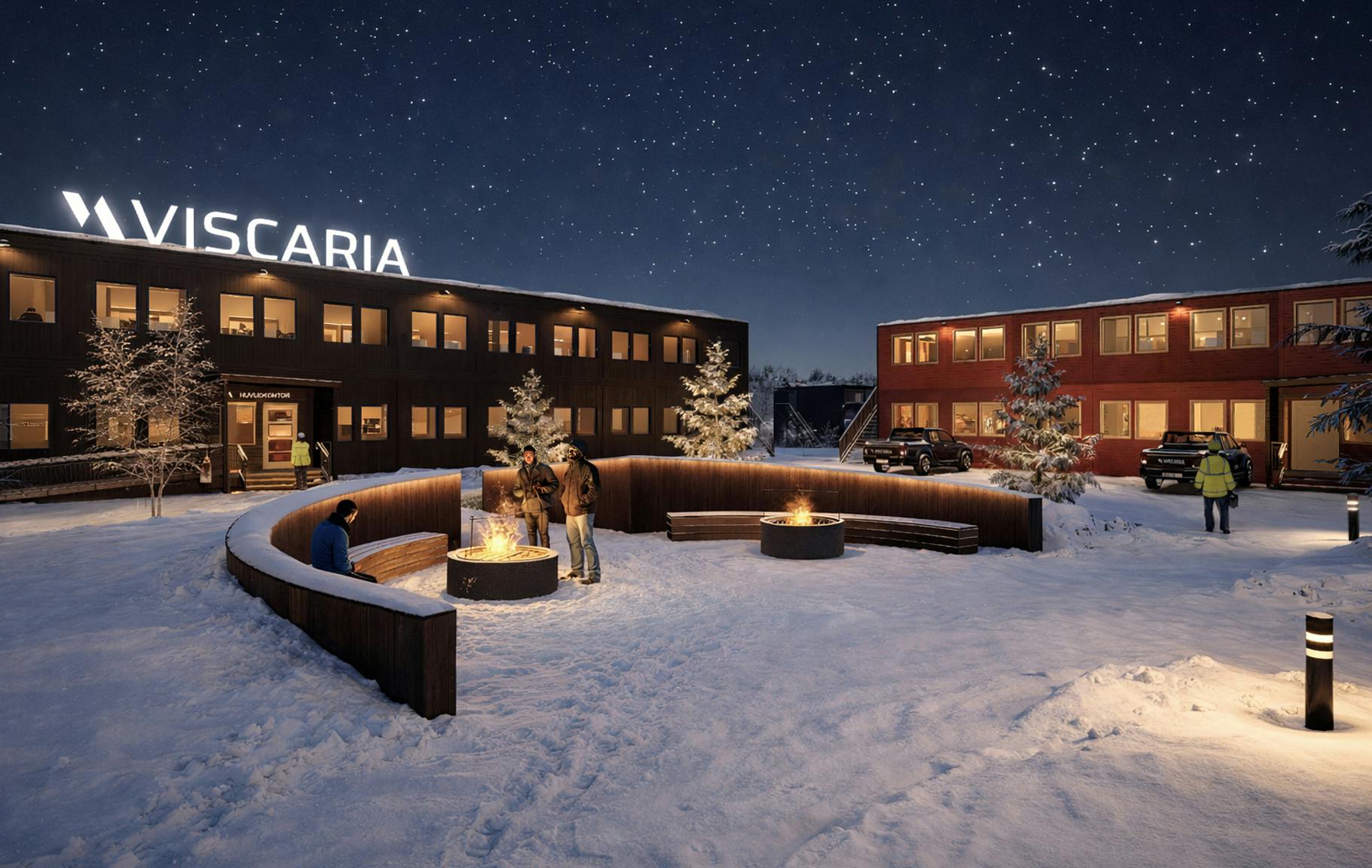 Som en del av uppdraget gestaltades Viscaria Village med kontor, tillfälliga boenden och en välkomnande receptionsbyggnad. Området utformades som en byggd miniatyr av gruvområdet, från vilket gestaltningsprogrammets principer av färg, material och form tar stor inspiration.