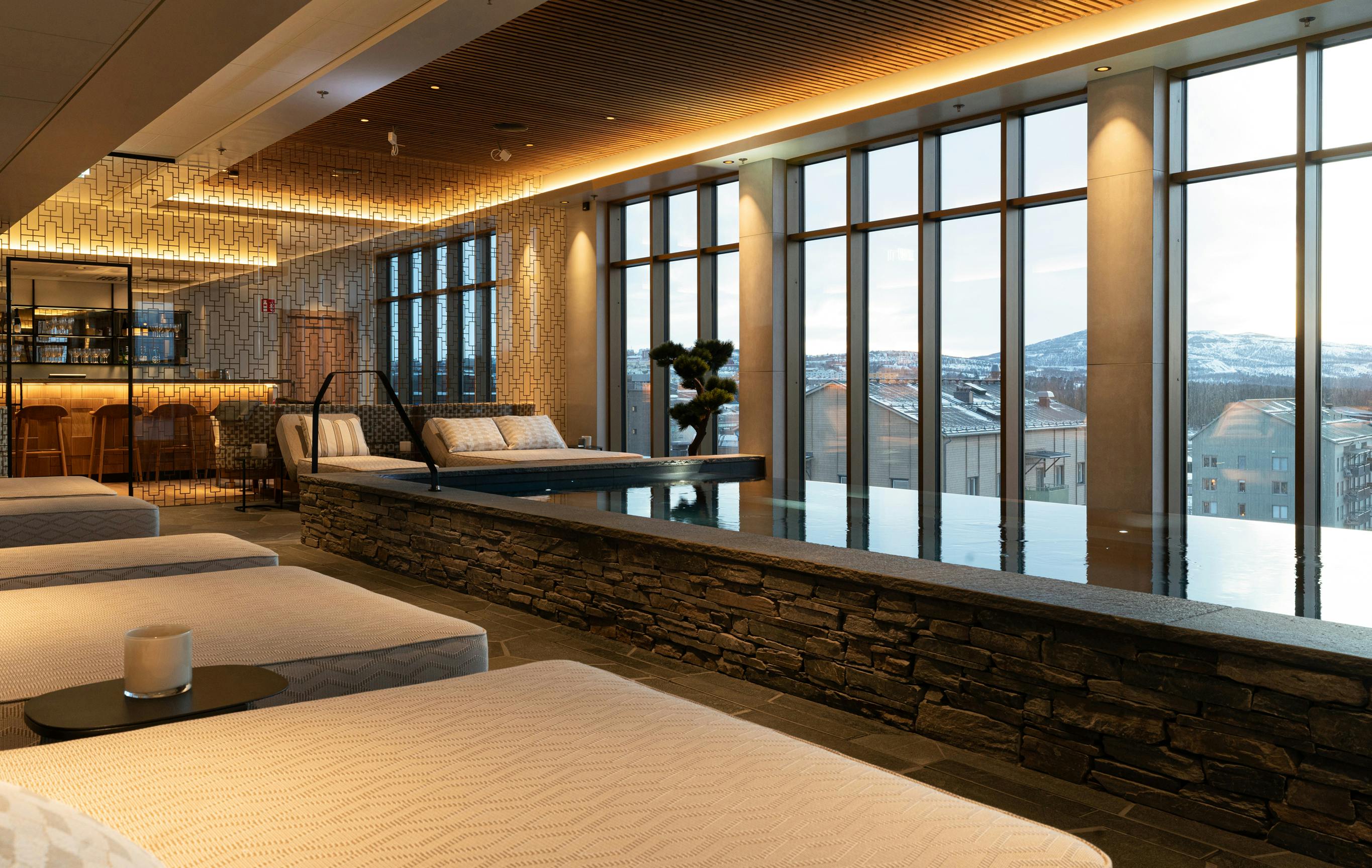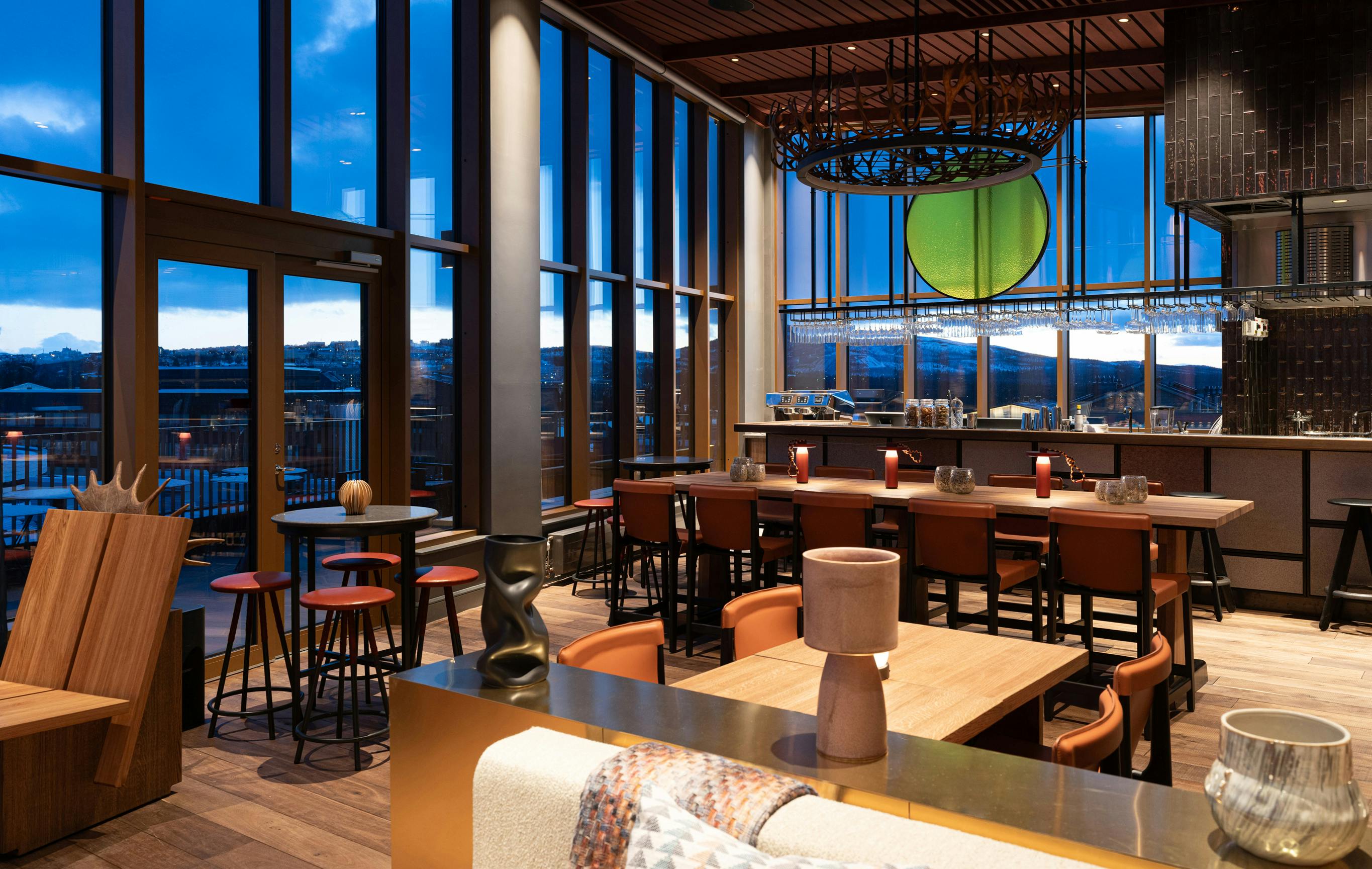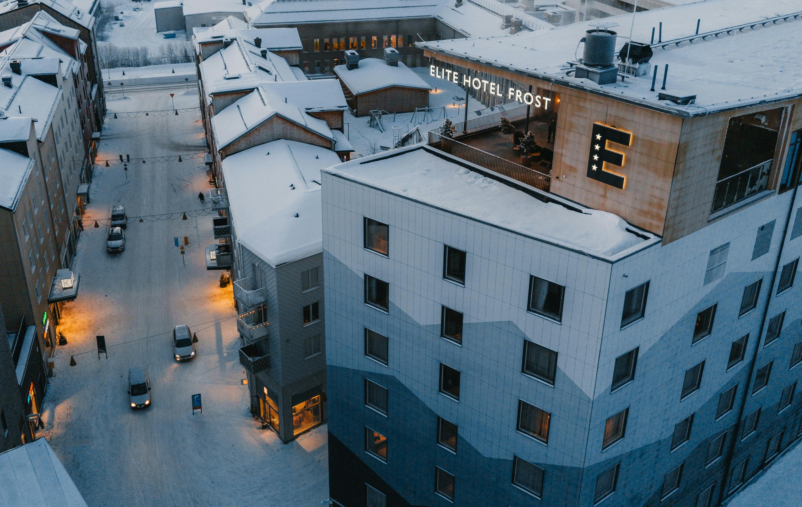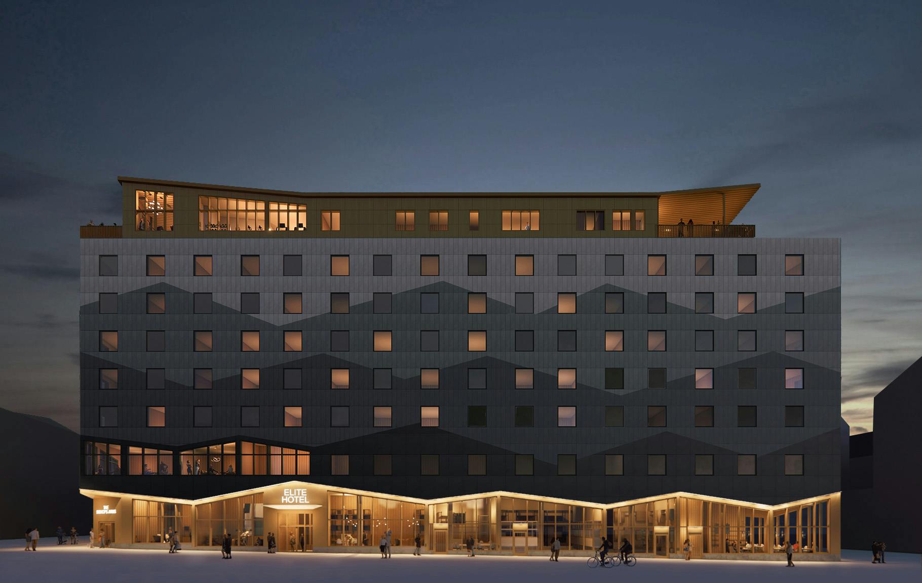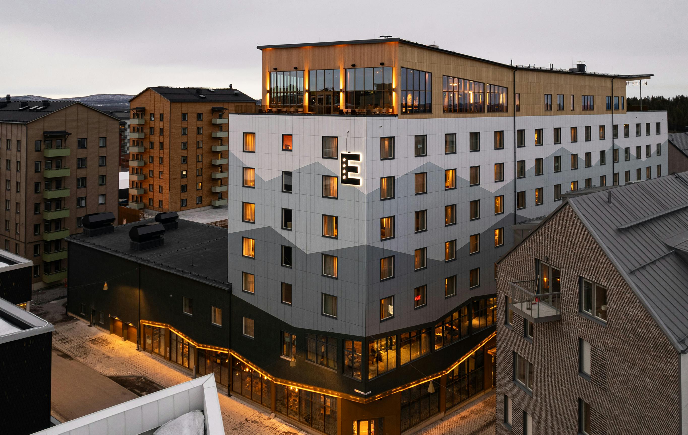 Byggnadens fasad har ett mönster inspirerat av det kringliggande fjällandskapets vyer, med fjäll på olika avstånd i blågröna nyanser. Entréplanet och översta våningen som är de mest publika delarna är generöst uppglasade och utförs i varmare träkulörer och en guldfärgad metall. Från skybar och rooftop spa kan besökaren njuta av Kirunas unika midnattssol och norrsken.